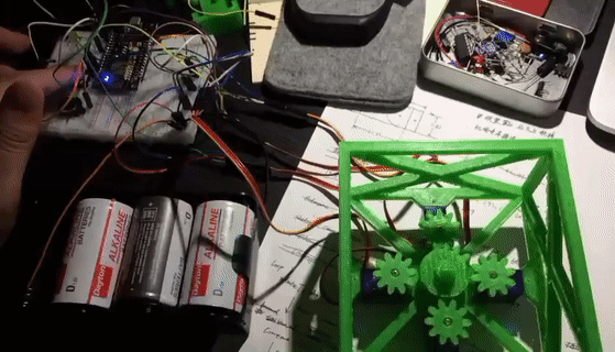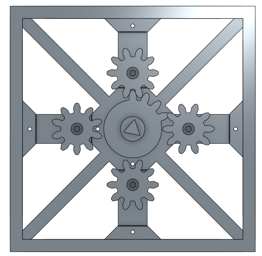 Each of the four gears on the sides is attached to a servo. The central master gear is turned by the four gears one at a time so that each servo only needs to rotate a little bit more than 90°. The pitch circle of the master gear is also larger than that of each servo gear, so that each servo can provide enough torque to rotate the master gear. The triangle insert at the end of the master gear fit in the triangle hole on the coupler so that the knob can be turned. Every piece is 3D printed and assembled together. The four servo gears need to work with each other in a timely manner so that they can “pass” the master gear from one to another, and this requires quite amount of calibration and code modification. The final prototype works like this (click to see animated gif):